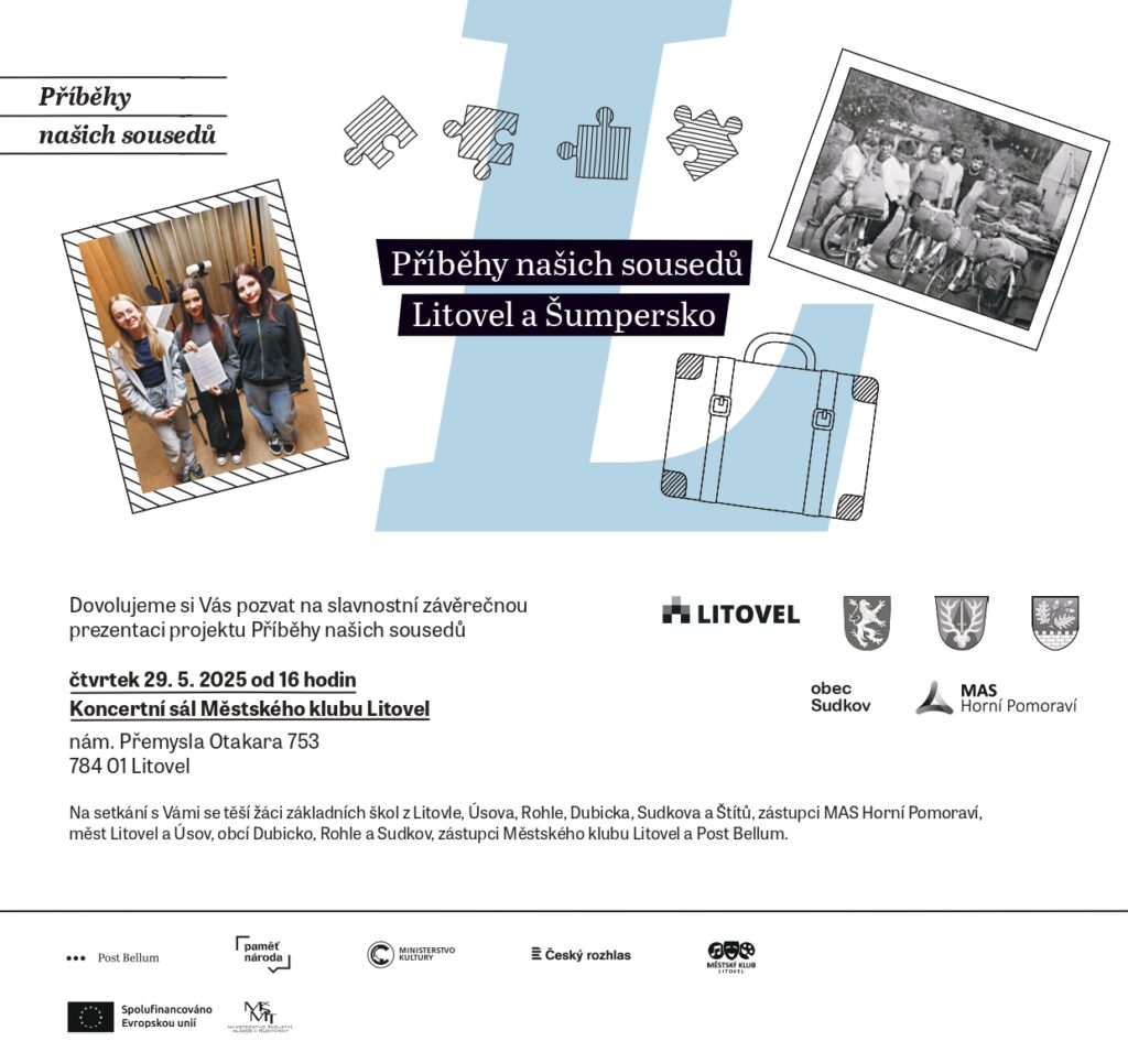 Srdečně zveme veřejnost na slavnostní závěrečnou prezentaci projektu Příběhy našich sousedů, která se uskuteční ve čtvrtek 29. května 2025 od 16 hodin v koncertním sále Městského klubu Litovel.